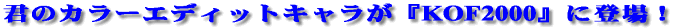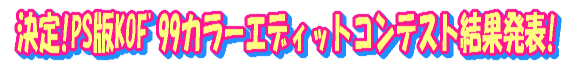 プレイステーション版「ザ・キング・オブ・ファイターズ’99」の中から、現在開発中のアーケード版「ザ・キング・オブ・ファイターズ2000」に登場するキャラクター1体を予想して、カラーエディットモードでそのキャラクターのオリジナルカラーを作成してご応募下さい。 予想的中者の中から5〜10体の優秀作品を選抜して、「ザ・キング・オブ・ファイターズ2000」で実際に採用します。さらに、採用された方のお名前をスタッフロールに掲載いたします。 |